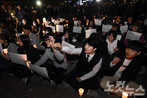 지난해 11월 17일 오후 서울 종로구 보신각 앞에서 열린 ‘박근혜 하야 고3 집회’ 참가자들이 구호를 외치고 있다. (사진=황진환 기자)