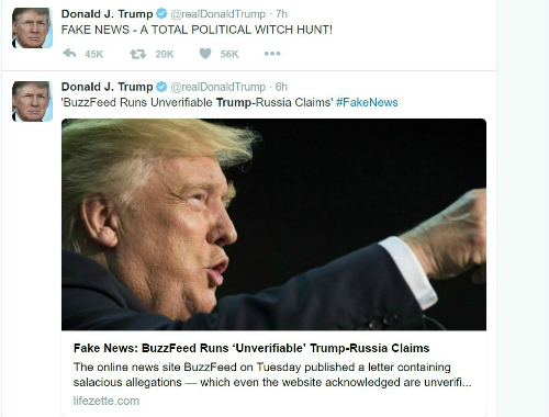 버즈피드의 보도가 일파만파로 번지자 트럼프 당선자는 트위터를 통해 버즈피드의 보도 내용을 "가짜 뉴스"라고 비난하면서 "정치적인 마녀사냥"이라고 일축했다. 그러면서 "가짜뉴스: 버즈피드가 확인되지 않은 보도를 했다"는 다른 뉴스 기사를 링크로 걸면서 반박했다.