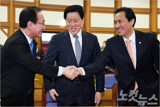 12일 오전 국회에서 열린 박근혜 정부 적폐 청산과 개혁입법과제 야3당-퇴진행동 공동토론회에 (우측부터)더불어민주당 우상호, 국민의당 주승용, 정의당 노회찬 원내대표가 인사를 하고 있다. (사진=윤창원 기자)