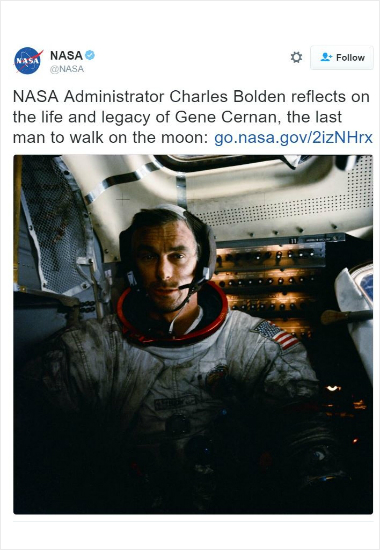 인류 역사상 마지막으로 달에 발자국을 남기고 돌아온 우주비행사 유진 서넌이 현지시간으로 16일 향년 82세로 별세했다.