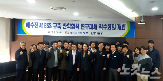 한국동서발전은 24일 울산 본사에서 동서발전과 유니스트(울산과학기술원) 실무자들이 참석한 가운데 '세계 최초 해수전지 ESS(에너지저장시스템) 구축 산학협력 연구과제 간담회'를 개최했다.