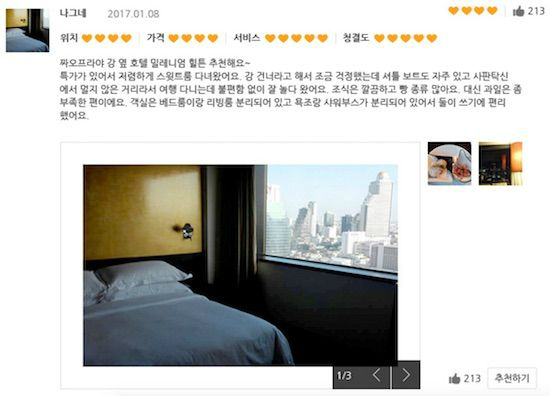 리뷰를 작성해주는 모든 숙박객에게는 카페라떼를 증정하며 매달 베스트 리뷰 1명에게는 백화점 상품권 5만원권, 3명에게는 영화관람권 1매를 증정한다.