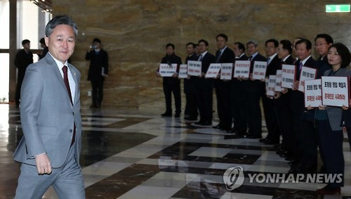 더불어민주당 표창원 의원이 자신의 사퇴를 요구하는 새누리당 의원들 사이로 걸어가고 있다. (사진=연합뉴스 제공)