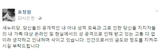 앞서 표 의원은 페이스북에 "새누리당, 당신들의 공개적인 내 아내 성적 모욕과 그로 인한 당신들 지지자들의 성 공격으로 인해 받고 있는 고통(을) 다 업이라 생각하고 인내하며 삭이고 있다"며 "인간으로서의 금도와 정도를 지켜주시길 부탁드린다"고 말하기도 했다.
