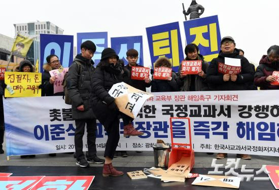 보수단체인 '국가교육국민감시단'의 김정욱 사무총장은 "역사 교육은 정치권의 영향을 받아서는 안된다"며 "(정부가) 스스로 한 내용을 자꾸 바꾸면서 신뢰도를 떨어뜨리는 잘못을 하고 있다"고 주장했다.