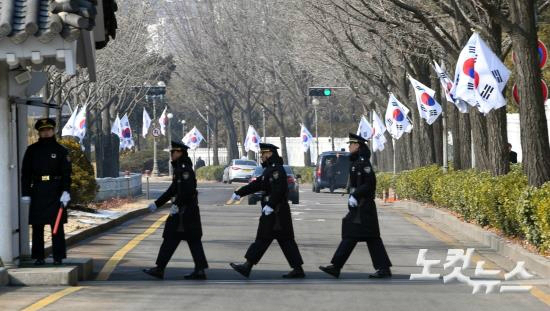 박영수 특별검사팀이 청와대 압수수색을 시도 한 3일 오전 청와대 춘추관 앞에 경호원이 경호를 강화하고 있다. (사진=이한형 기자)
