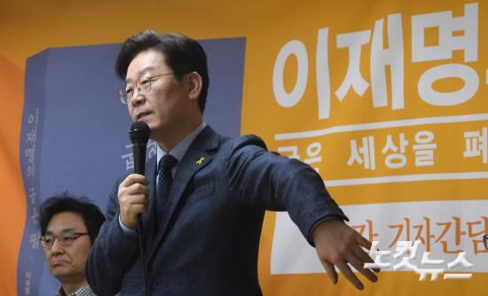 이재명 성남시장이 8일 오전 서울 중구 환경재단 레이첼 카슨홀에서 열린 자서전 '이재명의 굽은 팔' 출판 기념 간담회에서 소감을 말하고 있다.