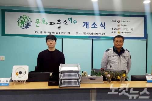 여수 문화파출소에 상주하는 정진용 문화보안관, 김관중 센터장의 모습. (사진=전남CBS 김유리 아나운서)
