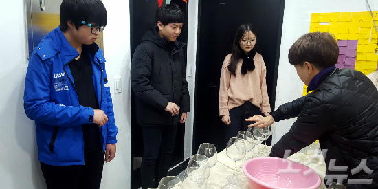 학생들이 여수문화파출소 리빙사운드 프로그램에 참여해 글래스 하프를 배우고 있다. (사진=전남CBS 김유리 아나운서)