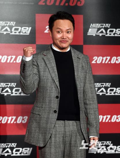 배우 김민교가 13일 오전 서울 광진구 롯데시네마 건대입구점에서 열린 영화 ‘비정규직 특수요원’ 제작보고회에 참석해 포토타임을 갖고 있다.