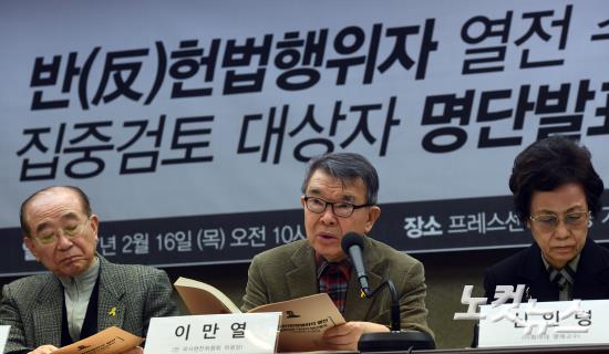 16일 오전 서울 태평로 프레스센터에서 열린 ‘반(反)헌법행위자 열전 수록 집중검토 대상자 명단발표’ 기자회견에 참석한 이만열 전 국사편찬위원장이 발언을 하고 있다. 이번에 선정된 집중검토 대상자 중에는 박근혜 대통령과 황교안 대통령 권한대행 국무총리도 포함돼 있다.