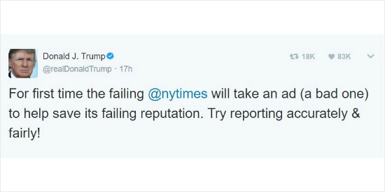 그러자 또 트럼프가 반격에 나섰다. 트럼프 대통령은 이날 자신의 트위터에서 “망해가는 뉴욕타임즈가 망해가는 명성을 되살리기 위해 광고-나쁜 광고-를 한다고 한다. 그냥 정확하고 공정한 보도나 하시지”라며 비아냥댔다.
