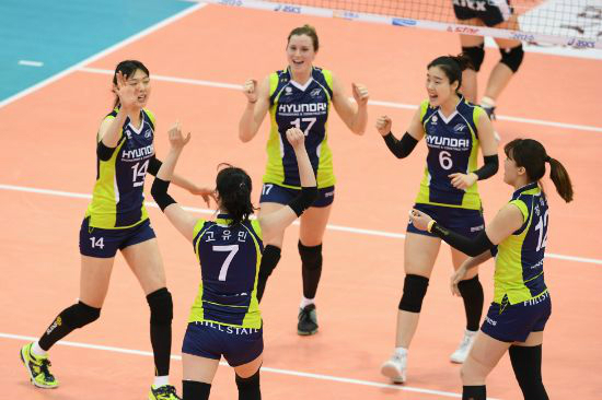 현대건설이 3일 수원실내체육관에서 열린 NH농협 2016~2017 V-리그 흥국생명과 경기에서 풀세트 접전 끝에 승리를 따내며 연패를 마감하고 '봄 배구' 진출 가능성을 끌어올렸다. (사진=한국배구연맹 제공)