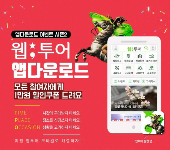 온라인 전문여행사 웹투어(www.webtour.com)는 창립 21주년을 맞아 3월 31일까지 모바일 앱 다운로드 이벤트를 진행한다.