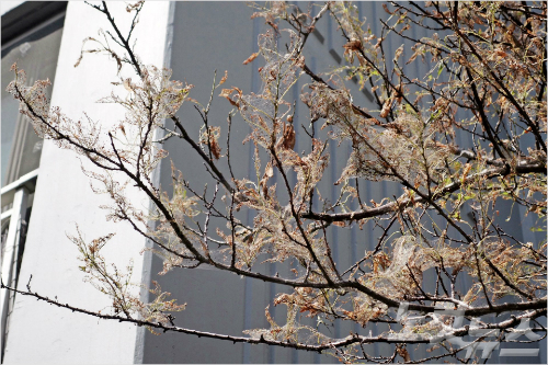 부산 해운대구의 한 아파트 내에서 미국 흰불나방 피해가 발생한 모습.(사진=송호재 기자)