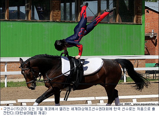 국내에는 아직 생소한 마상체조(vaulting)는 승마술과 체조 동작을 결합한 스포츠로, 일정한 속도로 원형마장을 도는 말 위에서 기승자가 말의 리듬과 속도에 맞춰 연기를 펼치는 경기다.[BestNocut_R]