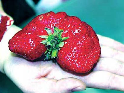 17일 중국 상하이 청년보에 따르면 부채꼴 모양의 이 딸기는 한 중학교 교사가 성인 손바닥 만한 딸기를 발견하고 현장에서 구입했는데, 이 교사를 포함해 아무도 이 딸기를 시식해보려 하지는 않는다고.