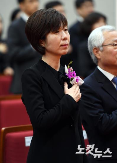 이선애 헌법재판관이 29일 오전 서울 종로구 헌법재판소에서 열린 취임식에서 국민의례를 하고 있다.