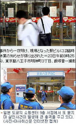 일본 아사히신문은 22일 오후 9시40분쯤 도쿄 하치오지市의 게이오 하지오지 쇼핑센터 9층 서점에서 30대 남성이 흉기를 마구 휘둘러 여대생 아르바이트 종업원(22)이 숨지고 서점의 여성 손님(21)은 부상을 입었다고 보도했다.