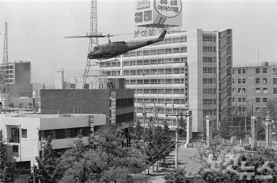 80년 5.18 당시 군 헬기가 전일빌딩 주변을 비행하고 있다. (사진=5.18기념재단 제공)