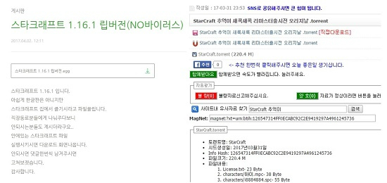 이와 달리 토렌트로 유포되는 파일은 압축 형태가 아닌 게임 파일 전체를 내려받게 된다. 게임 파일에는 정상 실행파일명 'starcraft.exe'가 아닌, '스타.exe'로 이름이 변경됐으며 이 파일을 실행하하게 되면 컴퓨터는 악성 파일에 감염된다.