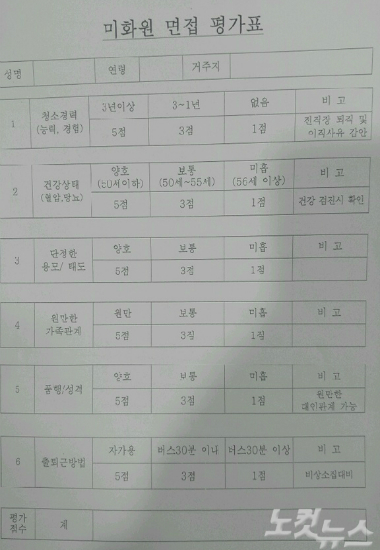 CBS노컷뉴스가 입수한 미화원 면접 평가표에는 청소경력, 건강상태(혈압, 당뇨), 단정한 용모·태도, 원만한 가정관계(배우자, 자녀), 품행·성격, 출퇴근방법 등이 평가 항목으로 존재했다.