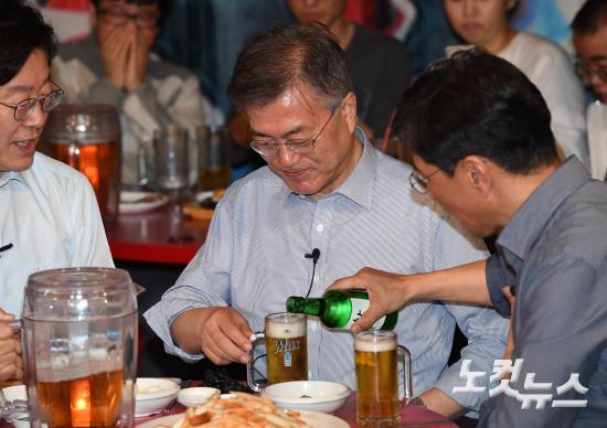 더불어민주당 문재인 대선후보(왼쪽 두 번째)가 8일 오후 서울 마포구의 한 호프집에서 열린 경선후보들과의 호프타임에 참석해 경선 경쟁자였던 안희정 충남지사에게 술을 받고 있다.