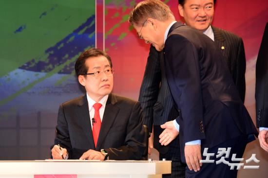 SBS와 한국기자협회가 공동으로 13일 서울 마포구 상암동 SBS 프리즘 타워에서 가진 ‘2017 국민의 선택, 대통령 후보 초청 토론회'에서 자유한국당 홍준표 후보와 더불어민주당 문재인 후보가 인사를 하고 있다.