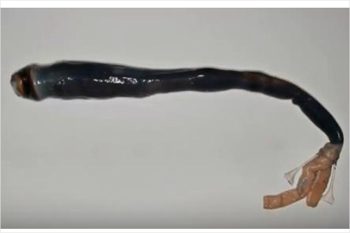 BBC에 공개된 동영상을 보면 과학자들이 조개 껍질의 한쪽 끝을 조심스럽게 자른 다음 조심스럽게 털어내는 모습을 보여주고 있다. 길고 칙칙한 검은 생물이 관 모양의 껍질밖으로 미끄러져 나와 보인다.