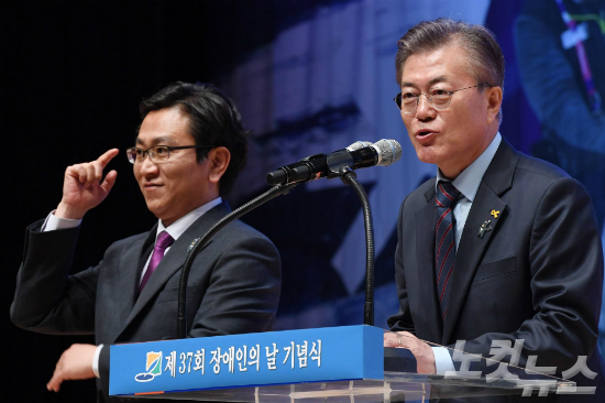 더불어민주당 문재인 대선 후보가 20일 강원 춘천 강원대학교 백령아트센터에서 열린 37회 장애인의 날 기념식에서 '내 삶을 바꾸는 정권교체' 장애인 정책을 발표하고 있다. (사진=박종민 기자)