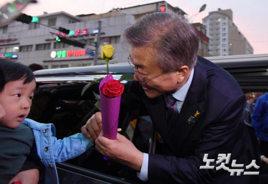 더불어민주당 문재인 대선 후보가 20일 충북 청주 성안길에서 집중 유세를 마친 뒤 이동하며 한 어린이가 건네준 꽃을 받고 있다.