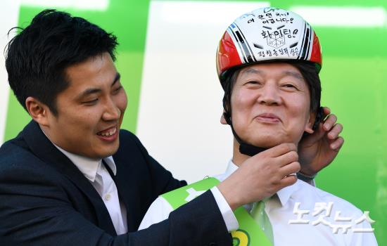 국민의당 안철수 후보가 26일 오후 강원도 강릉 중앙시장인근에서 선거유세 중 전 쇼트트랙 국가대표 송경택 선수로부터 헬멧을 받고 있다.