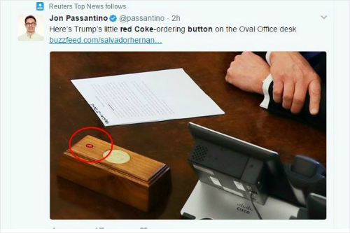 미국 현지시간으로 27일 도널드 트럼프 미국 대통령과의 단독 인터뷰를 진행한 로이터 통신에도 트럼프 대통령의 ‘콜라 단추’가 소개됐다.