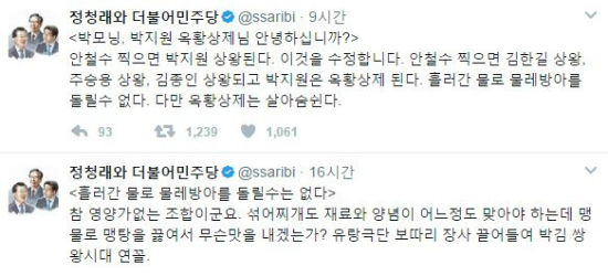 그는 "박지원 상왕론으로 상황이 안좋았는데, 이제 영양가 없는 김종인을 다시 상왕으로 모시고 박지원을 옥황상제로 격상시킨다. 안철수는 전략에서 실패하고 있다"고 비난했다.