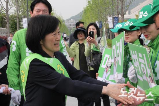 국민의당 안철수 후보 부인 김미경 교수가 2일 오후 서울 서대문구 연세대학교 앞에서 열린 지원유세에서 유세단원들과 인사를 하고 있다.
