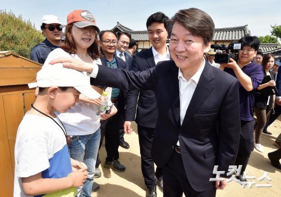 국민의당 안철수 후보가 4일 오전 경상북도 안동시 하회마을을 찾아 한 어린이의 머리를 쓰담고 있다.