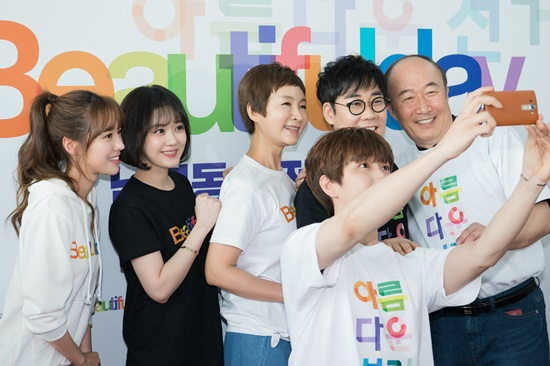 제19대 대선에서 아름다운 선거 홍보대사로 선정된 진세연, 장나라, 정애리, B1A4 산들, 김연우, 윤주상이 4일 오전 서울역 대합실에 마련된 투표소에서 사전투표를 마치고 셀카를 찍는 모습 (사진=라원문화 제공)