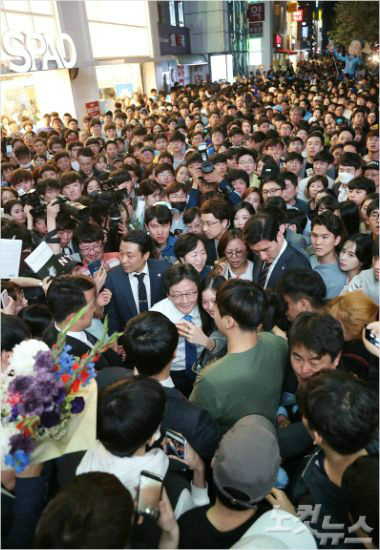 바른정당 유승민 후보가 지난 3일 서울 강남역 유세에서 지지자들과 인사를 나누고 있다. (사진=바른정당 제공)