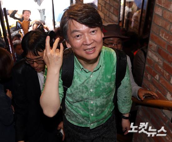 국민의당 안철수 후보가 5일 오후 부산 남포동 BIFF(부산국제영화제) 거리에서 갑자기 내린 소나기를 피하기 위해 커피숍으로 이동하고 있다.