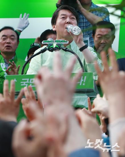 국민의당 안철수 후보가 6일 오후 광주시 금남로 거리유세에서 연설 중 물을 마시고 있다.