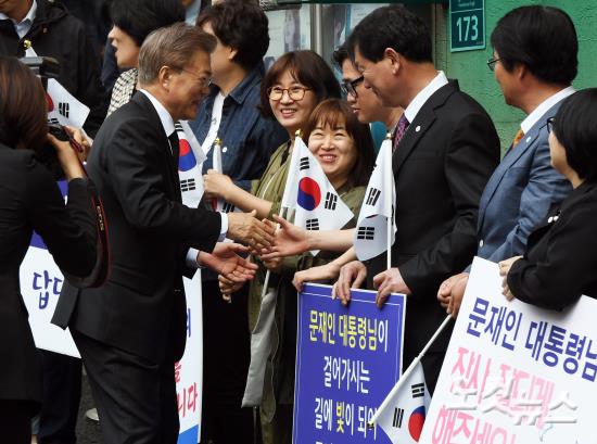 문재인 대통령이 10일 오전 서울 홍은동 자택을 나와 주민들과 인사나누고 있다.