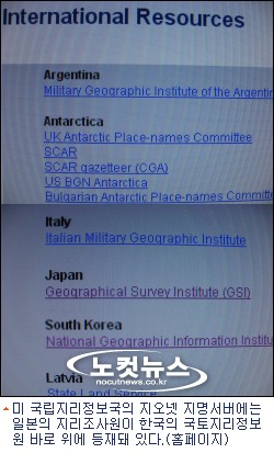 하지만 최근까지 NGA의 외국지명 데이터베이스 ''지오넷 지명서버''(GNS.Geonet Names Server)를 통해서는 한국의 국토지리정보원(NGII-www.ngii.go.kr)에 자동으로 연결이 되지 않았다.