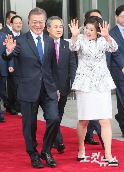 문재인 대통령과 영부인 김정숙 여사 10일 오전 서울 여의도 국회에서 열린 19대 대통령 취임식을 마치고 차량으로 이동하고 있다.