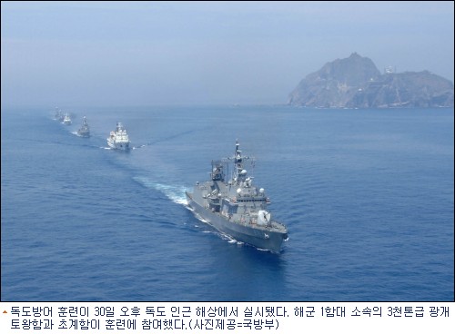 해군과 해경 함정, 공군의 최신예 F-15K 등이 참가하는 독도 방어 훈련이 30일 울등도와 독도 인근 해상에서 실시됐다.