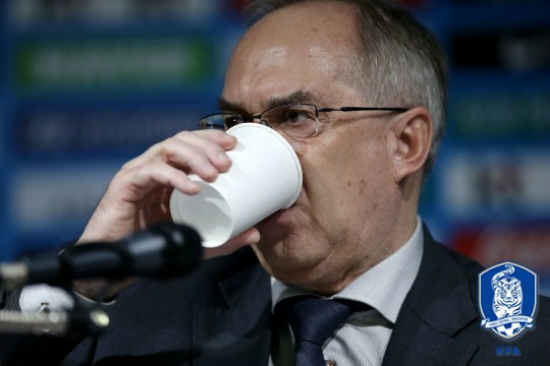 울리 슈틸리케 축구대표팀 감독이 22일 서울 축구회관에서 다음 달 14일 카타르 도하에서 열리는 카타르와 2018 러시아 월드컵 최종예선 8차전에 나설 24명의 선수 명단을 발표하면서 물을 마시고 있다. (사진=대한축구협회 제공)