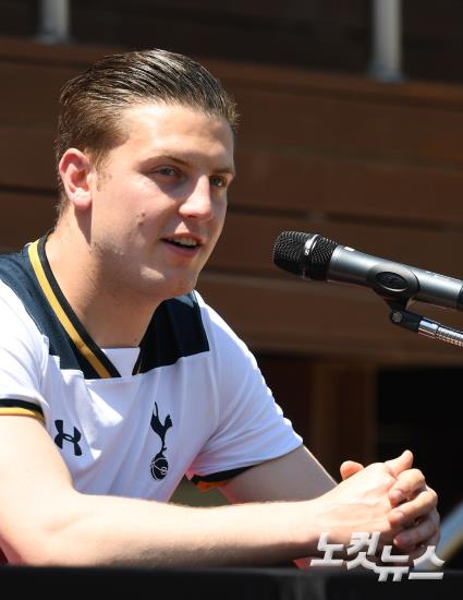 24일 오후 서울 강서구 가양레포츠센터에서 열린 AIA생명과 함께하는 토트넘 선수 방한 기념 및 장애아동 축구 클리닉 행사에서 영국 프리미어리그 토트넘 핫스퍼 케빈 비머 선수가 참석해 인터뷰를 하고 있다.