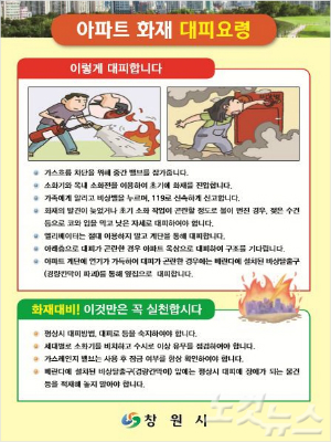 창원시는 고층아파트와 고층건물 화재 시 진화와 구조의 어려움으로 인해 다수의 인명피해가 발생할 우려가 있는 만큼 국민안전처의 고층건물 화재 시 국민행동요령을 바탕으로 화재 대피요령을 제작해 배포했다.