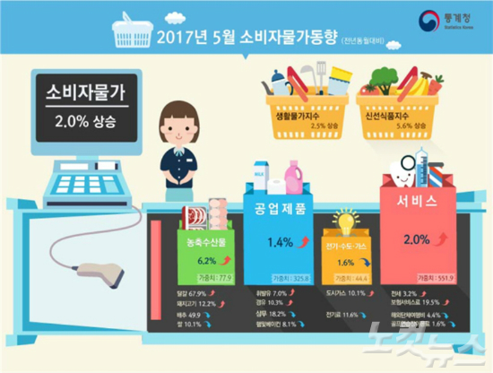 통계청이 1일 발표한 '5월 소비자물가동향'에 따르면 지난달 소비자 물가지수는 지난해 같은 달보다 2.0% 올랐다.