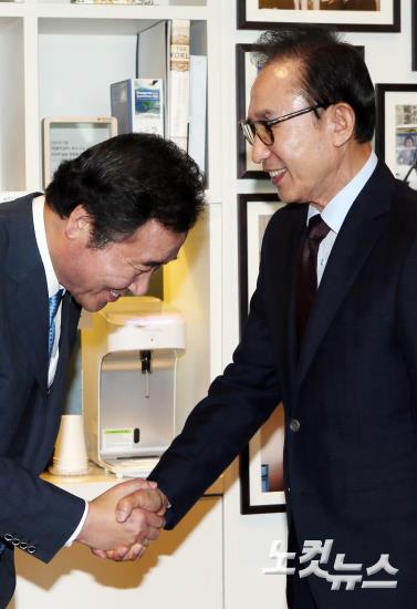이낙연 신임 국무총리(왼쪽)가 2일 오후 서울 삼성동 이명박 전 대통령 사무실에서 이 전 대통령과 악수를 하고 있다.