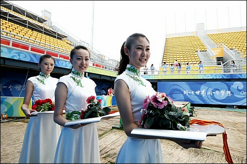 2008베이징올림픽 D-8인 31일 올림픽 양궁 경기장에서 열린 메달시상식 예행연습 도중 시상식 도우미들이 미소 짓고 있다.